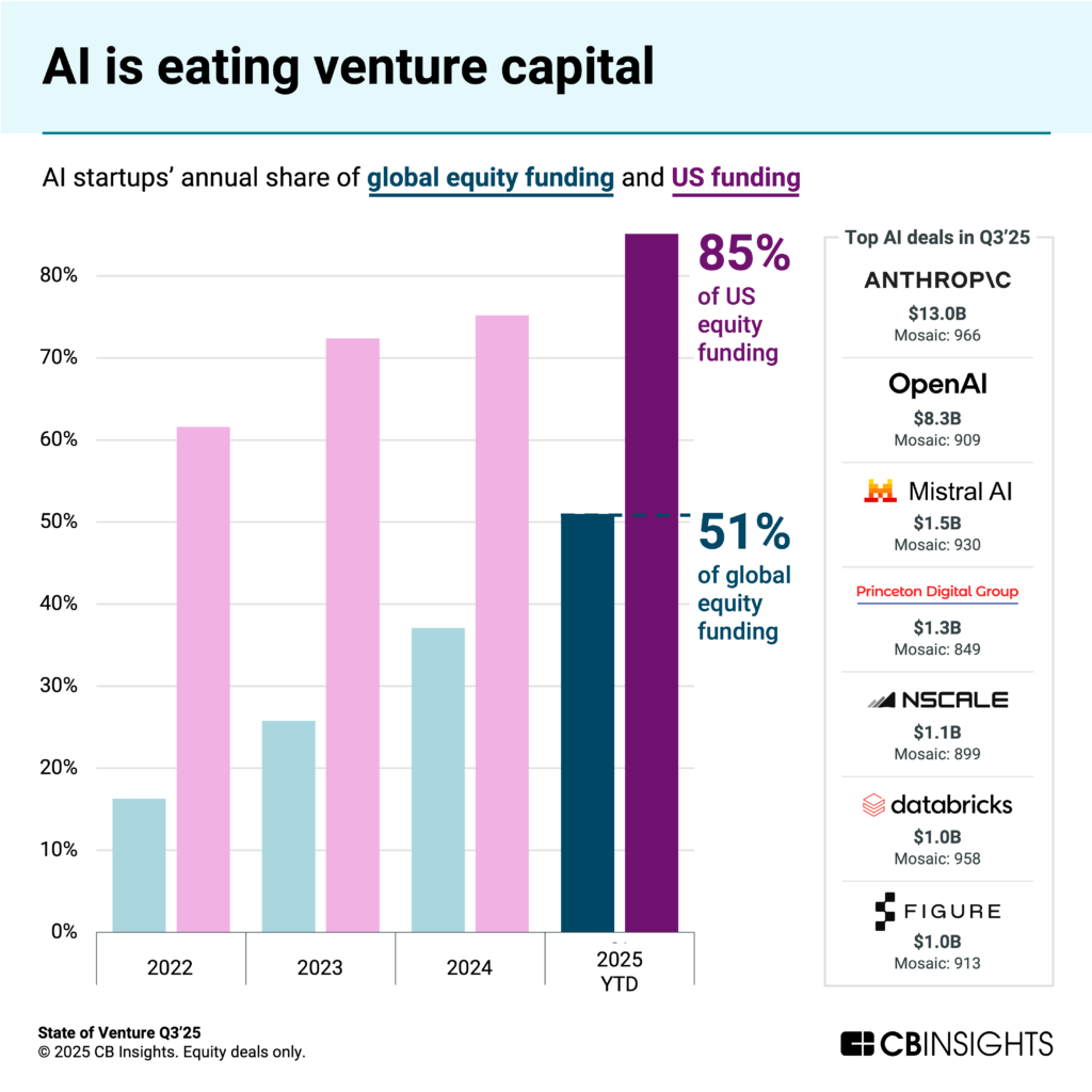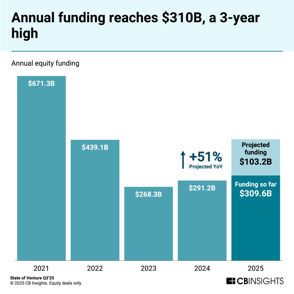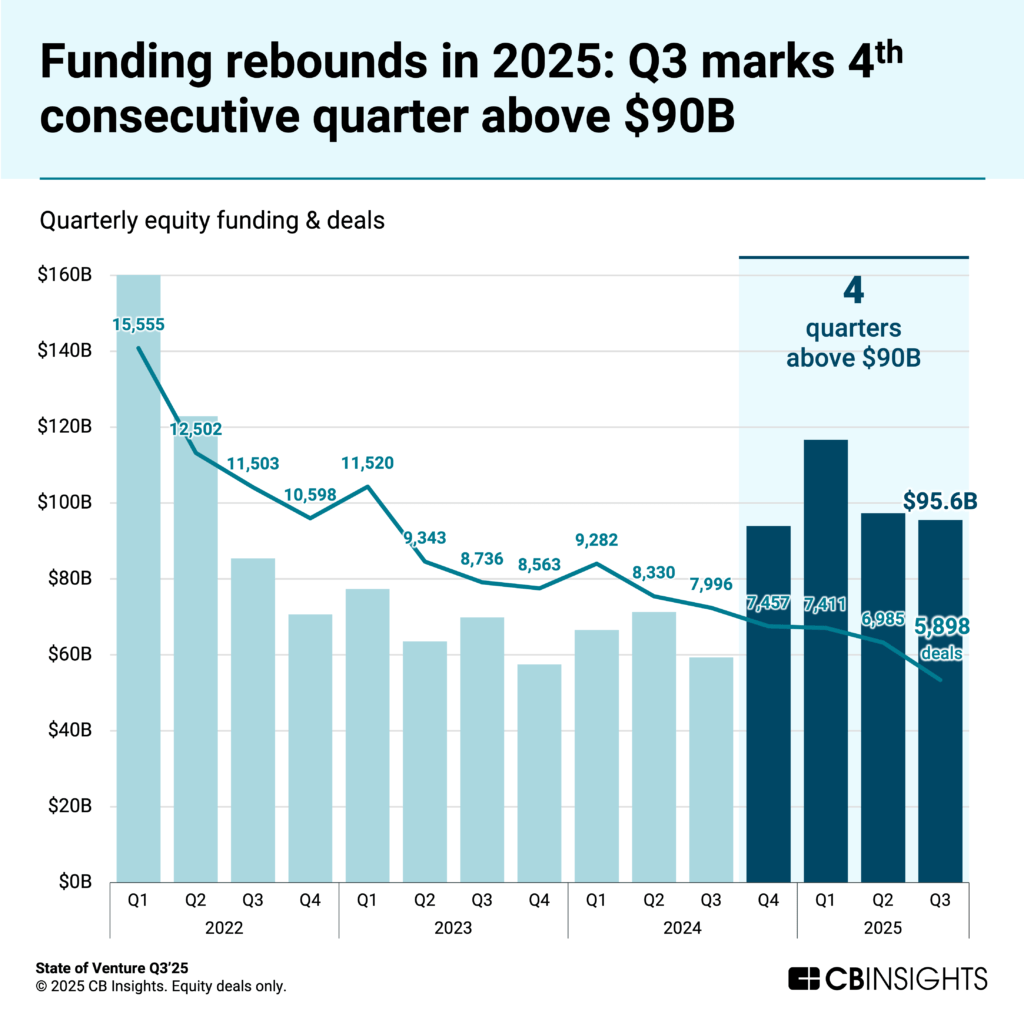 CB Insights claims that “Venture funding is rebounding in 2025 — reaching its highest annual level since 2022 — even as deal activity fell for the sixth straight quarter.” Figures taken from report. Comments Welcome.